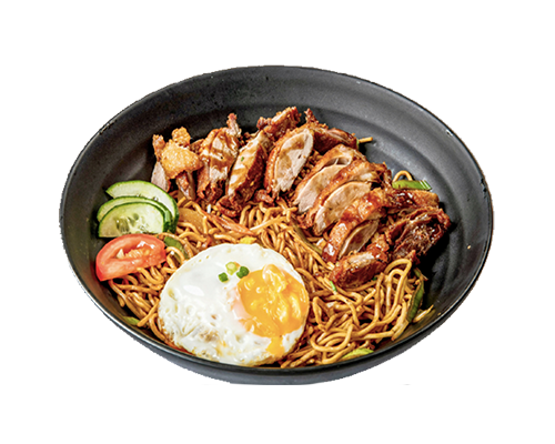 Bowl traditionnel à base de nouilles sautés aux légumes accompagné de tranches de canard croustillant