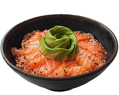 Riz vinaigré couvert de tranches de saumon et d'avocat