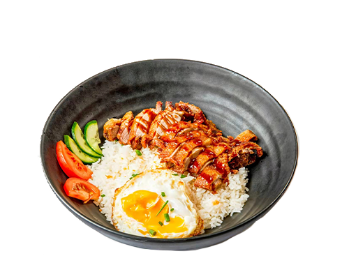Bowl traditionnel à base de riz blanc accompagné de tranches de canard croustillant