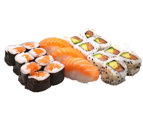 8 California saumon avocat, 8 Maki saumon, 3 Sushi saumon, salade de choux ou soupe miso