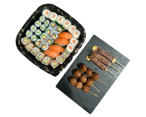 - California Saumon Avocat - Maki Concombre - Flocon Saumon Fromage - Crispy Thon Cuit Avocat - Sushi saumon x4 - Boeuf Fromage x3 - Boulette de poulet x2