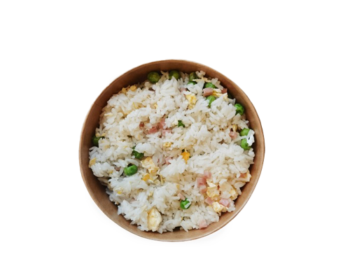 Riz cantonais sauté avec des œufs, petit pois et des morceaux de jambon